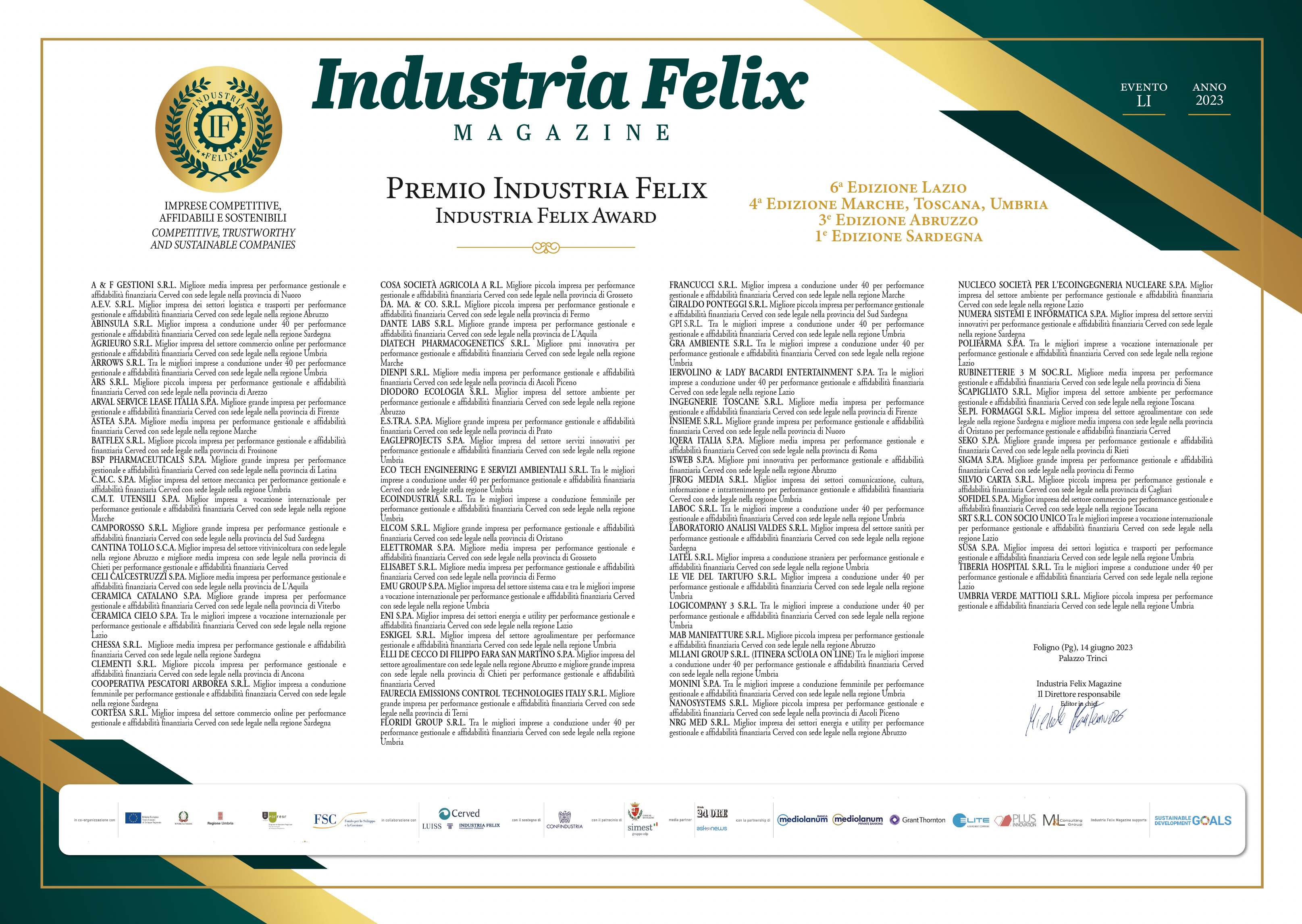 Il premio Industria Felix , fondato dal giornalista Michele Montemurro e organizzato da industria Felix Magazine, in supplemento con il SOLE 24 ORE, si sviluppa sulla base di una maxi inchiesta sui bilanci dell’anno 2021 di 700.000 società di capitali in collaborazione con Cerved group. Le imprese premiate sono state individuate da un qualificato Comitato Scientifico coordinato a livello nazionale dal professore Cesare Pozzi docente dell’Università Luiss Guido Carli.