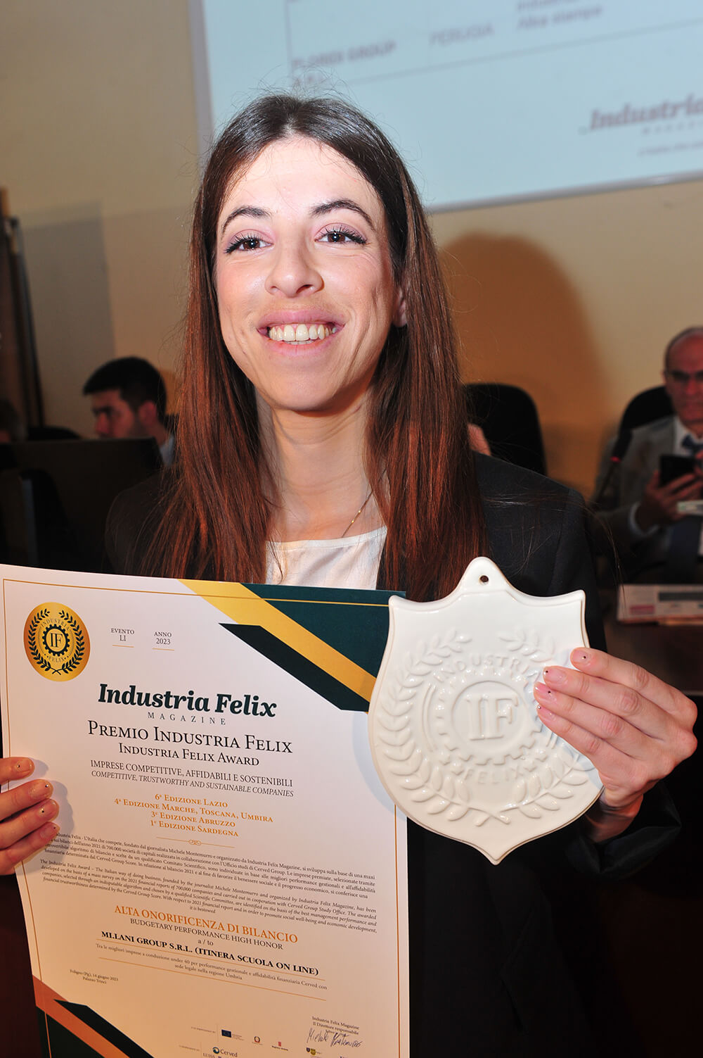 L'AD della Mi.lani group srl, dott.ssa Laura Di Grazia, ha ritirato il prestigioso riconoscimento delle alte onoreficenze di bilancio, durante la celebrazione del 51° Premio Industria Felix avvenuta mercoledì 14 giugno a Foligno presso Palazzo Trinci alla presenza dell’Assessore alla programmazione europea, bilancio e risorse umani e patrimoniali, turismo, cultura, istruzione e diritto alla studio della Regione Umbria Paola Agabiti della Regione Umbria, il questore di Perugia Giuseppe Bellassai e il sindaco di Foligno Stefano Zucchini.